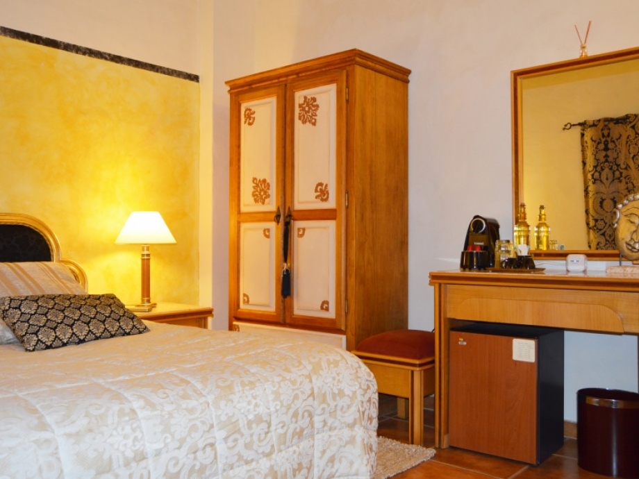 Suite Charme, inserida na Casa Mãe, quarto duplo com cama de casal, wc privado e vista para o pátio de entrada.